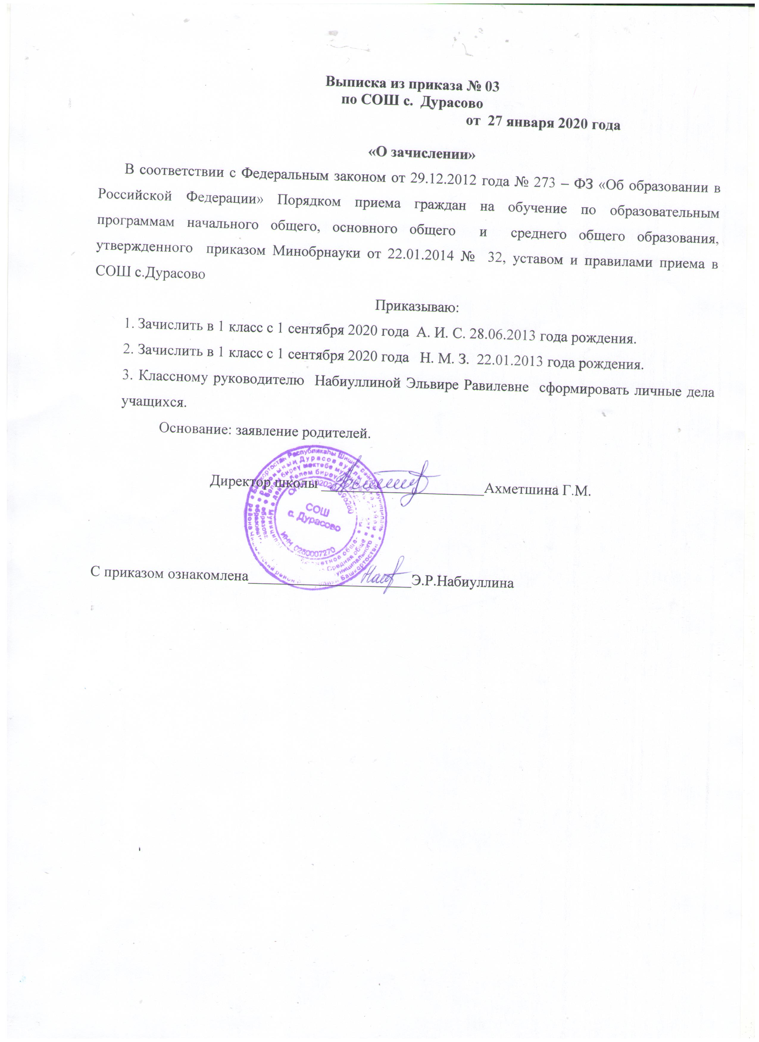 Приказ СОШ с.Дурасово от 20.03.2024 года № 65 "О назначении ответственных за прием в школу".jpeg